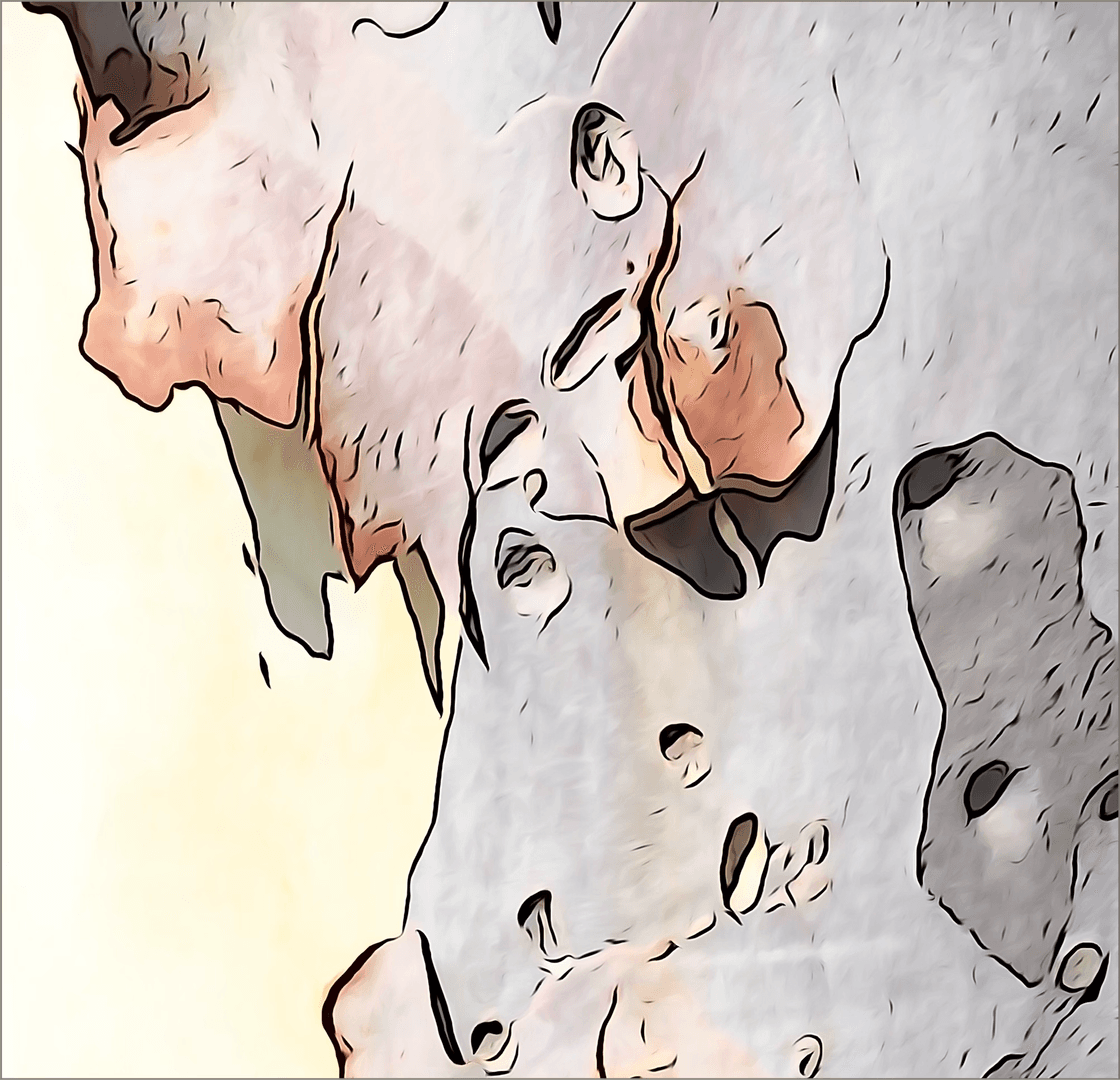 Eucalyptus trees lose their bark in summer. This one caught my eye at the local park, with the high morning sun casting vertical shadows and a clear white light.