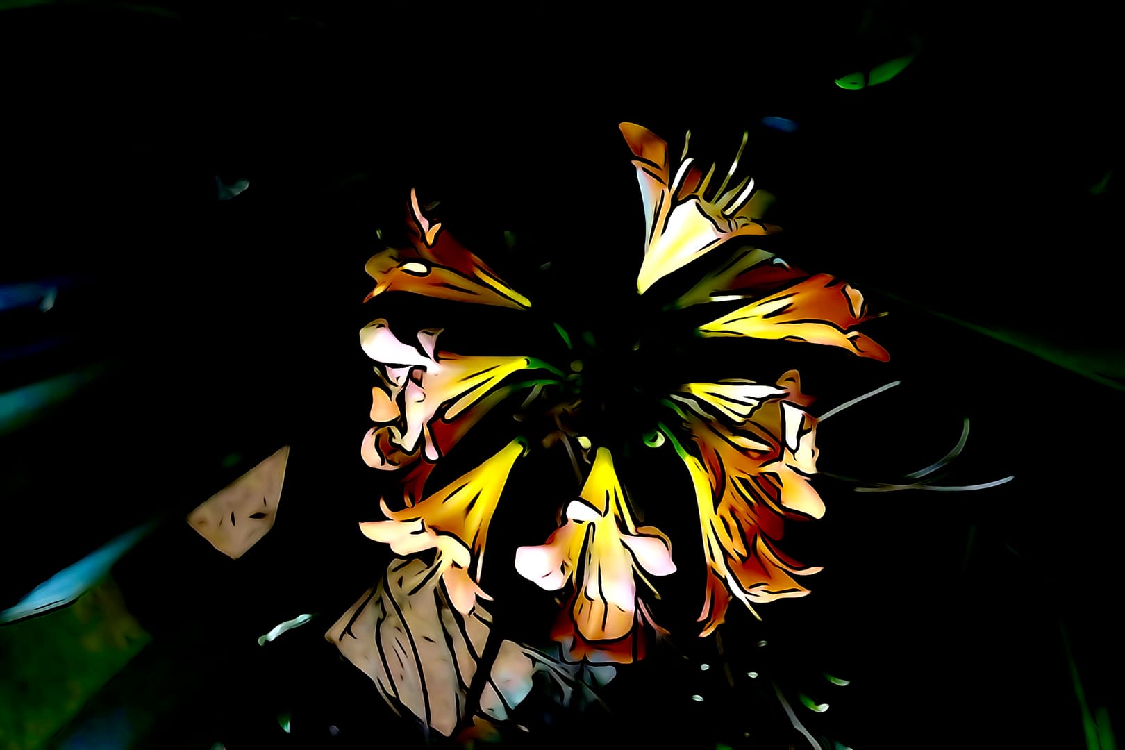 The ones in the garden are very orange, but have come out with flashes of yellow in this night photo.