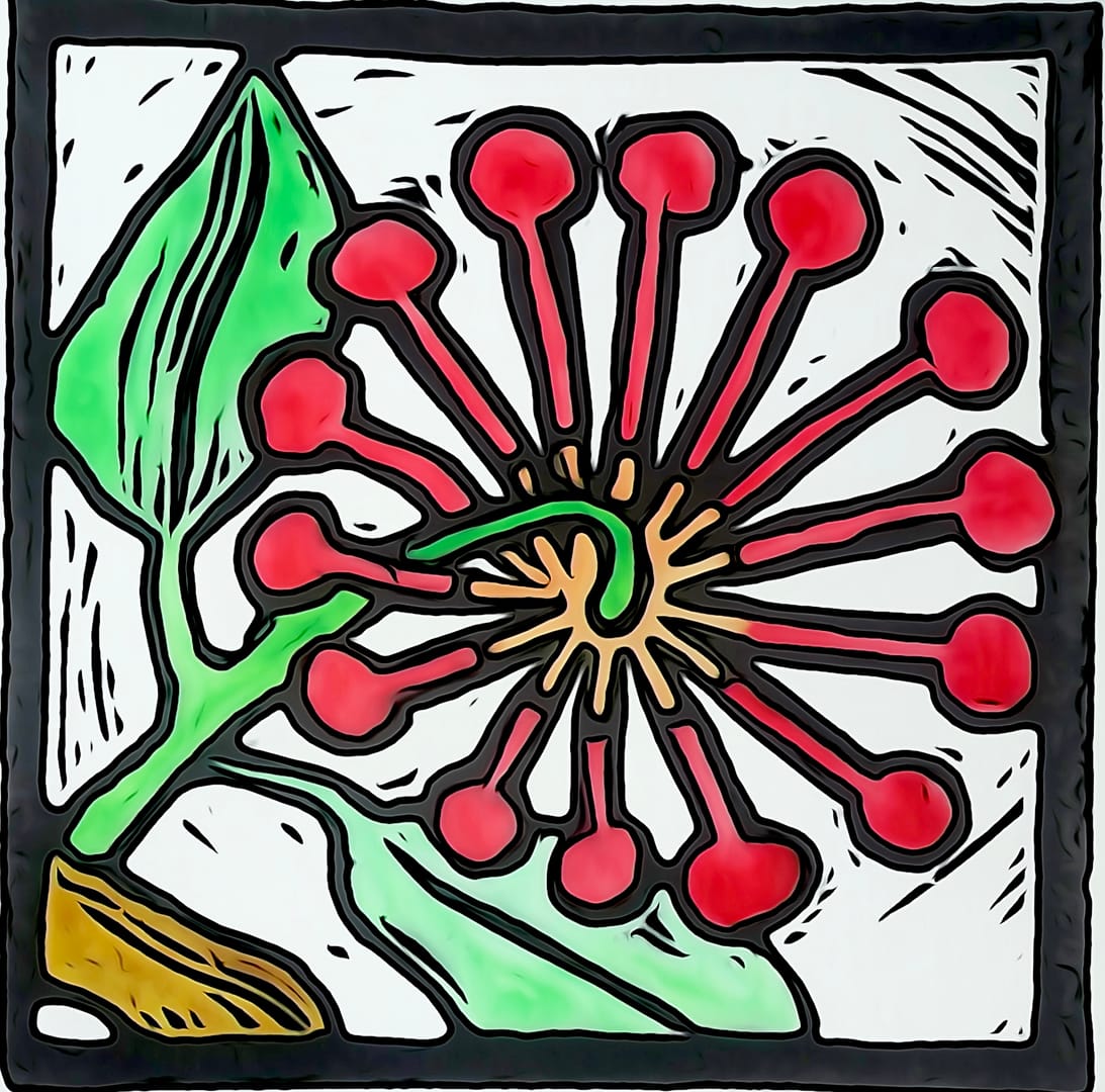 Firewheel flowers are hard to draw, as they are often high in the tree and hard to see. But this one was low, so I had a go doing a Lino cut.