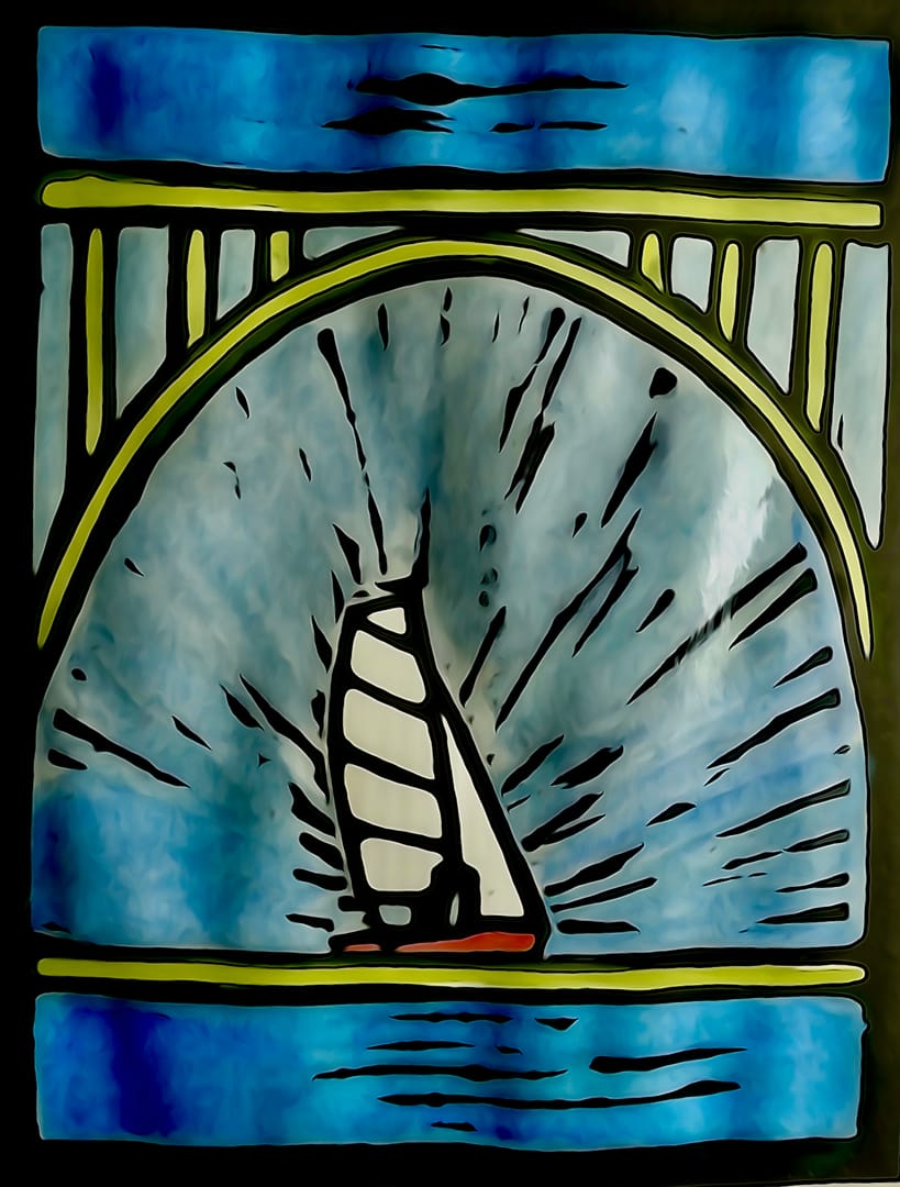 It occurred to me that a bridge over a sailing boat may make an interesting composition and while a vector art design may have come out cleaner that is not my forte. So I persisted with Lino and this is the result.