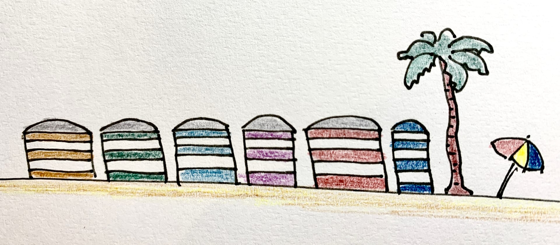 Playing around with pen and ink and coloured pencil. With little perspective, the tents have the same roofline and so get taller as the beach falls away.