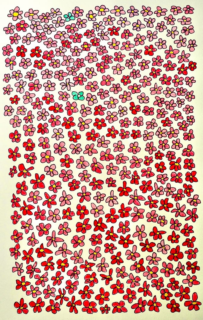 I thought I could do a mass of flowers, much as one sees in spring time. It took quite a long time to draw all the little flowers and then colour them in.